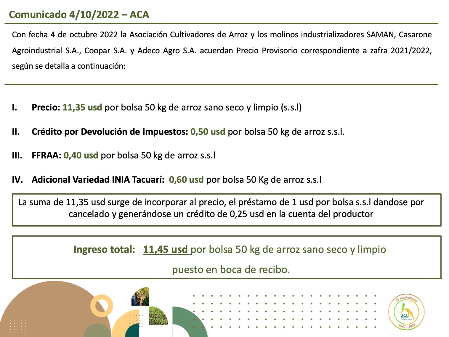 Precio de Arroz – 4-10-2022 Precio provisorio año agrícola – 2021/2022