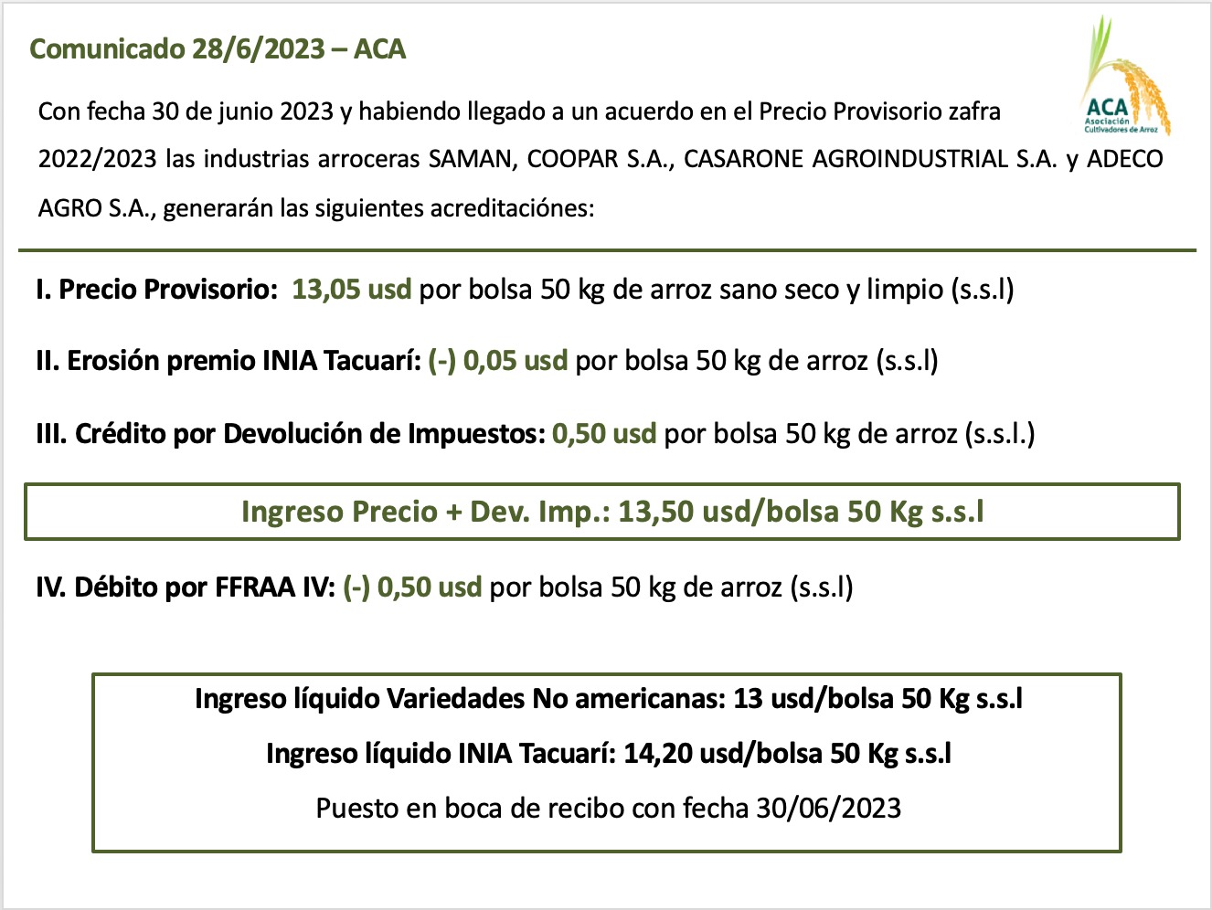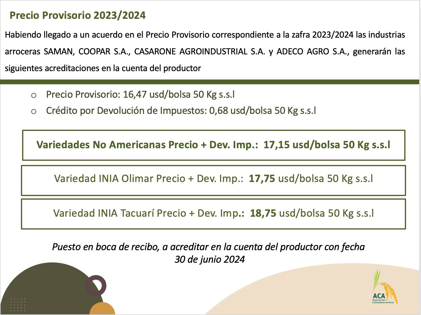 Precio de Arroz – 30-6-2023 Precio Provisorio Año Agrícola 2022-2023