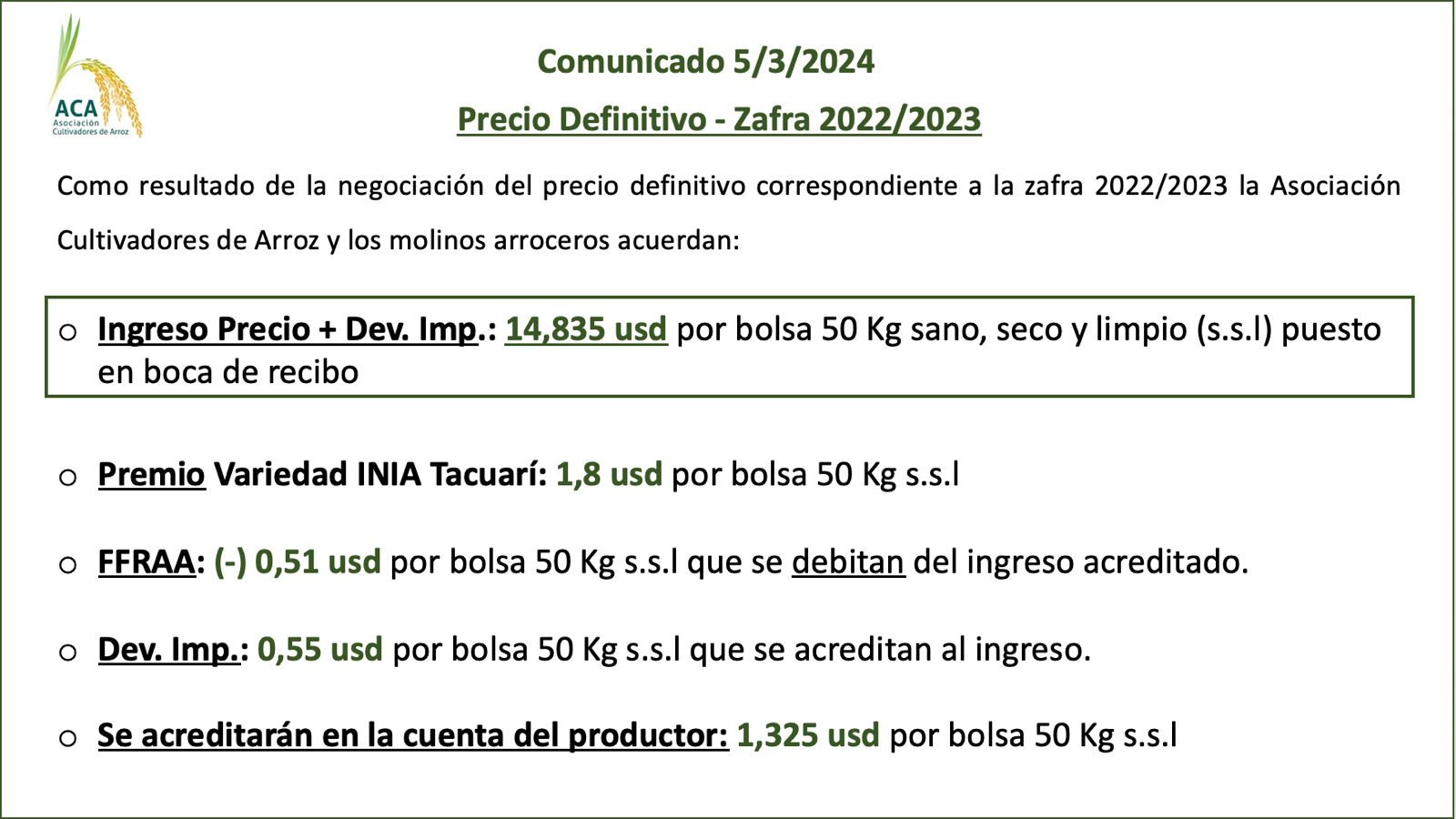 Precio de Arroz – 5-3-2024 Precio Definitivo Año Agrícola 2022-2023