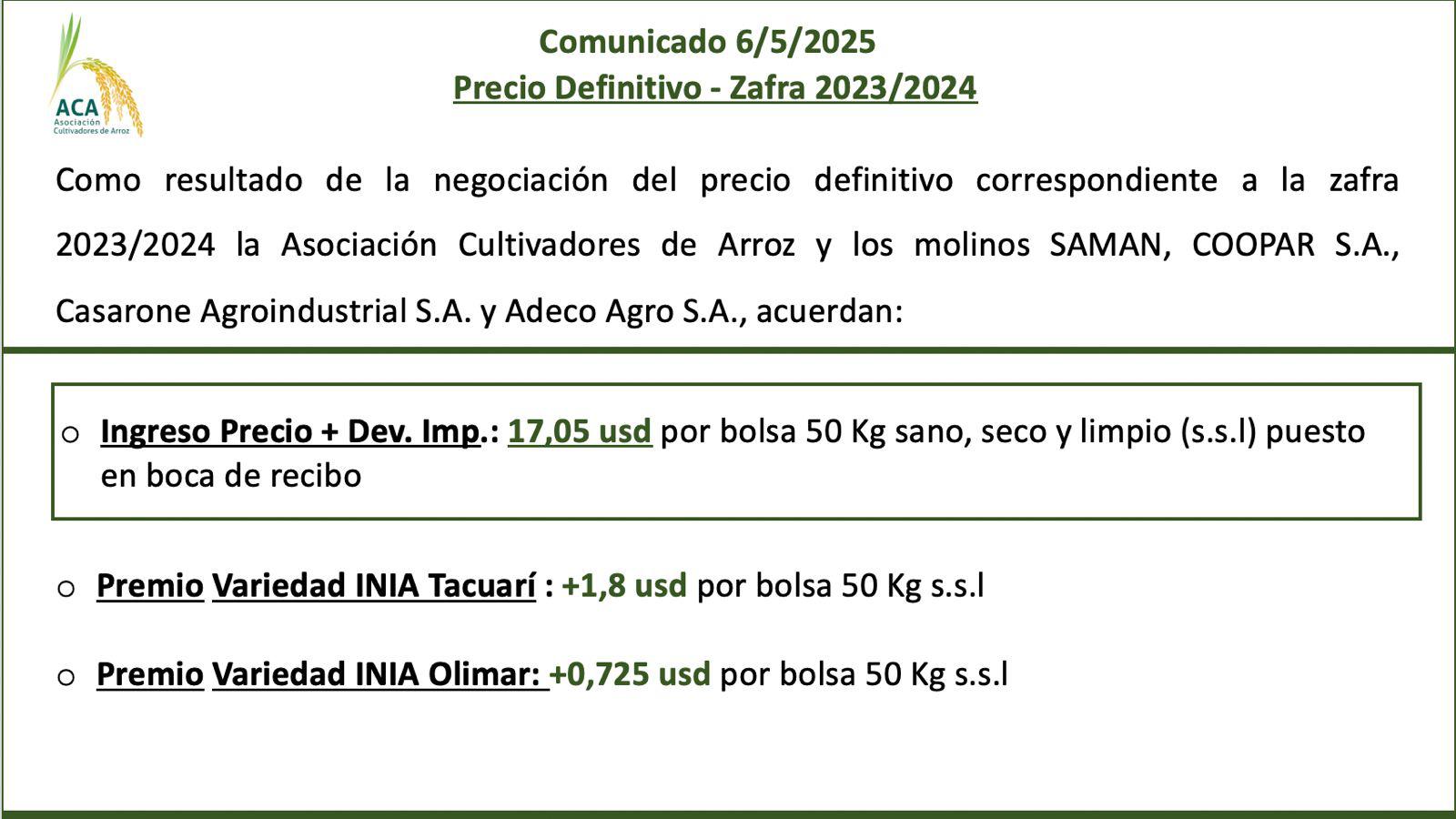 Precio de Arroz – 6/5/2025 Precio Definitivo Año Agrícola 2023/2024